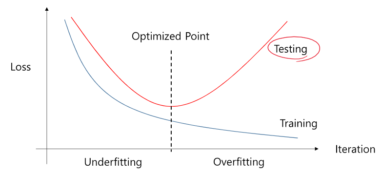 overfitting은 traning data에 과도하게 optimized 되어 training data만 예측을 잘 하고, test data에는 오히려 낮은 점수를 보이는 것이다.