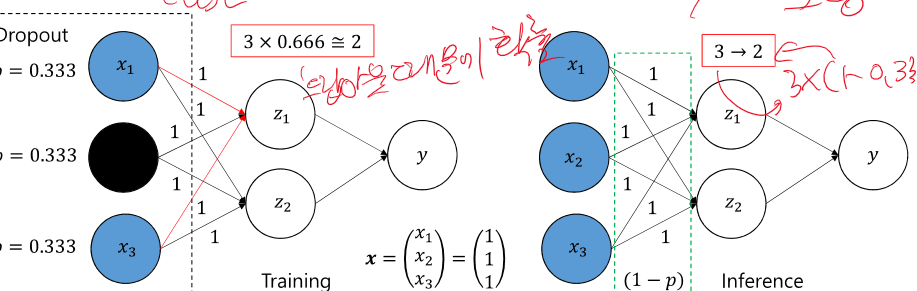 테스트 할 땐 drop out 없이 테스트 하는데 방식이 살짝 다르다.