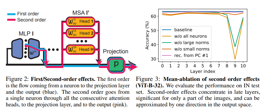 - 2차 효과 렌즈: 뉴런 활성화가 주의 레이어를 통해 출력에 도달하는 과정을 수학적으로 모델링하여 2차 효과를 정의했습니다. 뉴런의 2차 효과는 주로 후반 레이어에서 나타났으며, 각 뉴런의 2차 효과는 특정 이미지 세트(<2%)에만 강하게 나타났습니다.