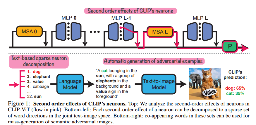 이처럼 CLIP에서는 2차 효과를 통해 다수의 뉴런이 상호작용하며 중요한 정보를 전달하게 되므로, 뉴런의 역할을 해석할 때는 이러한 2차 효과를 고려해야 모델의 내부 메커니즘을 더 명확히 이해할 수 있습니다.