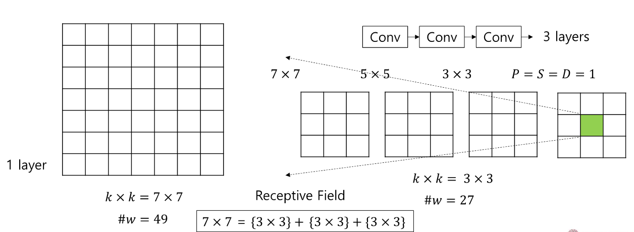 7*7을 한번 하나 3*3을 3번하나 관여영역(receptive field)는 같지만 파라미터의 수는 3*3이 훨씬 적다. 이러한 이유로 VGG에서도 3*3 filter를 여러번 사용하였다.