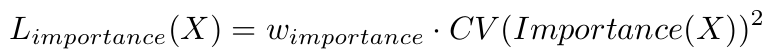 손실 정의: Importance Loss는 중요도의 변동성(coefficient of variation)을 최소화하도록 설계됩니다. 즉,각 전문가의 중요도가 비슷하도록 하는 손실 항으로 작동하며, 이를 통해 일부 전문가가 지나치게 많이 선택되는 상황을 방지합니다. 여기서wimportance는 손실 가중치,CV는 변동 계수(coefficient of variation)로, 중요도의 분산을 평균에 대한 비율로 측정하여 전문가들의 중요도가 일정하게 유지되도록 합니다.