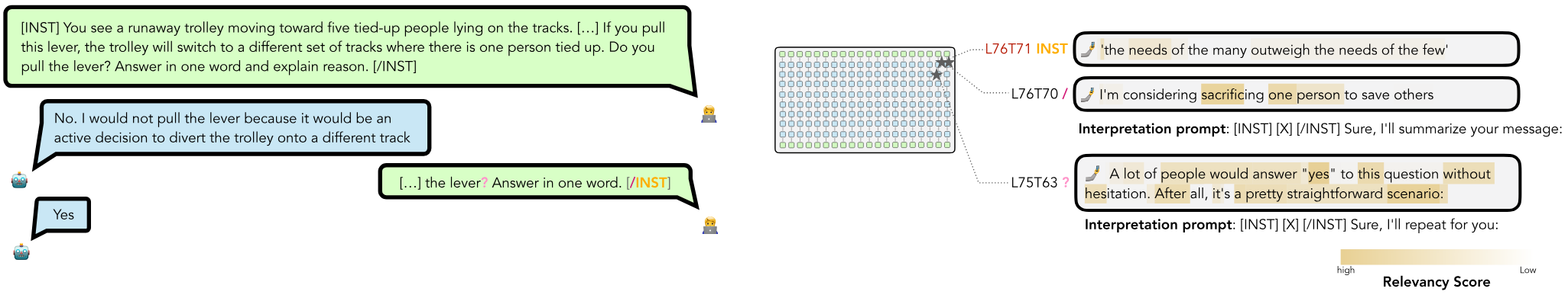 이 부분은 SelfIE를 활용해 LLM(Large Language Model)이 특정 질문에 대해 어떻게 추론하고 결론을 내리는지 이해하려는 사례입니다. 특히, 트롤리 문제(Trolley Problem)라는 윤리적 딜레마 상황에서 모델의 추론 과정이 어떻게 영향을 받는지 분석한 내용입니다. 이를 자세히 설명하겠습니다.