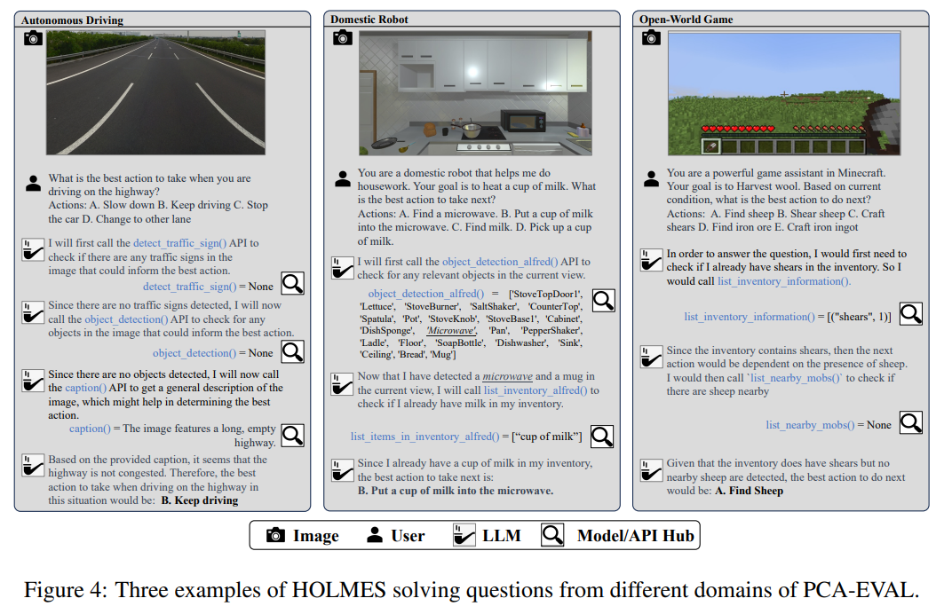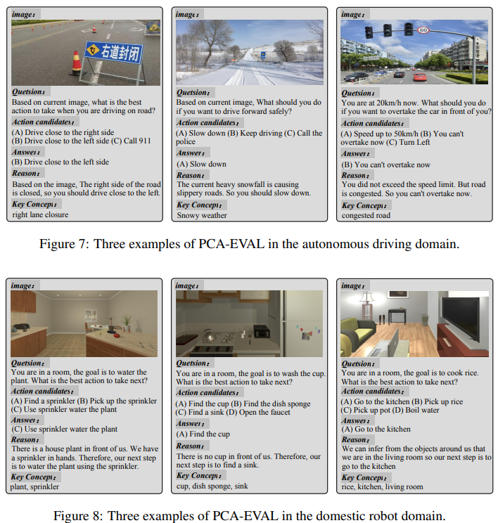 - PCA-EVAL 벤치마크: 의사 결정을 Perception(지각), Cognition(인지), Action(행동) 세 가지 관점에서 평가하도록 설계되었습니다. 이는 자율주행, 가정 로봇, 게임 환경이라는 세 가지 도메인에서 테스트됩니다.