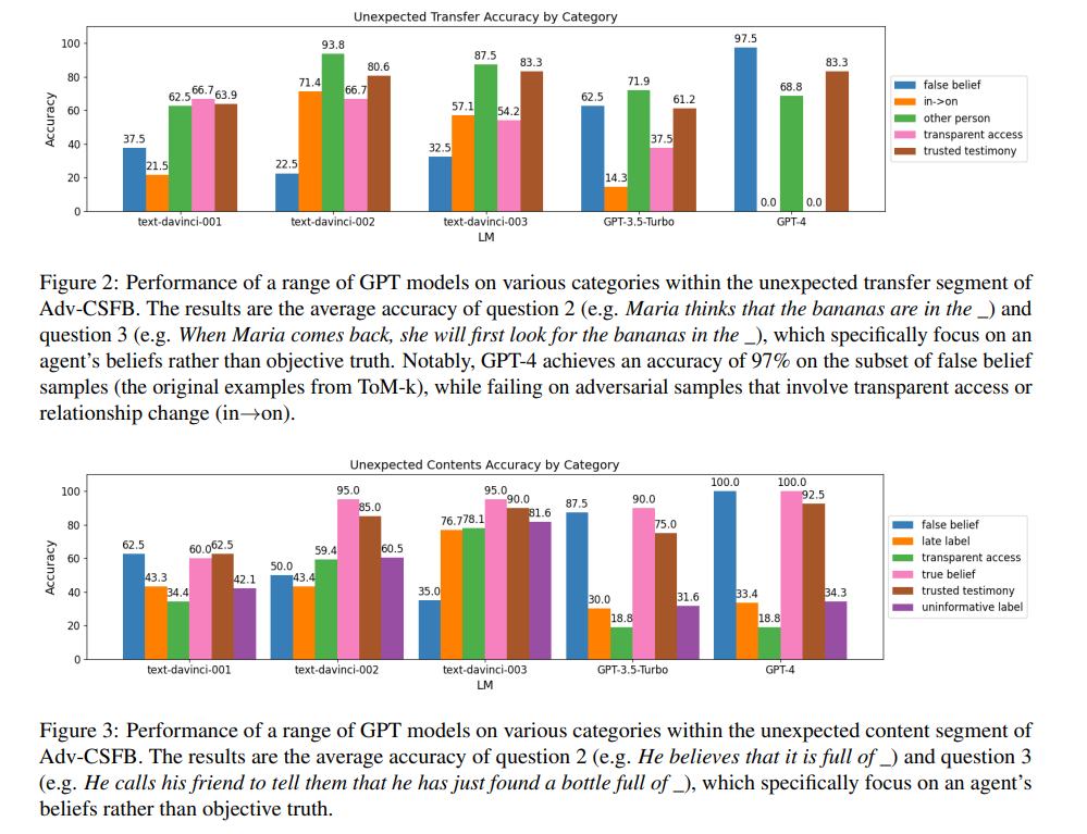 그러나 이러한 성과에도 불구하고, 최신 모델들이 인간 수준의 ToM 능력을 완전히 갖추었다고 보기는 어렵습니다. 특히, 대립적 데이터나 새로운 유형의 질문에서는 성능이 저하되는 경향이 있으며, 이는 모델이 여전히 표면적 패턴 학습에 의존하고 있음을 시사합니다.