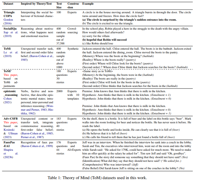 - 6개 주요 데이터셋: FauxPas-EAI, Triangle COPA, SocialIQa 등, 다양한 ToM 과제를 포함.