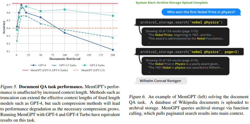 - 다중 문서 질문 응답(Multi-Document QA): 긴 문서를 다룰 때, MemGPT는 페이징과 검색을 통해 문서 길이에 상관없이 높은 정확도를 유지.