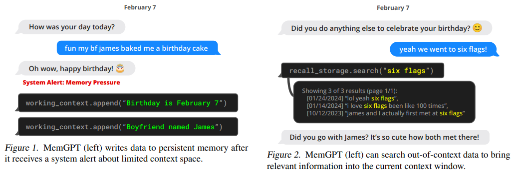 - MemGPT: 외부 메모리에 데이터를 지속적으로 저장하며, 필요에 따라 이전 대화 기록이나 문서를 반복적으로 불러올 수 있습니다. 이를 통해 장기적인 기억 관리가 가능합니다.