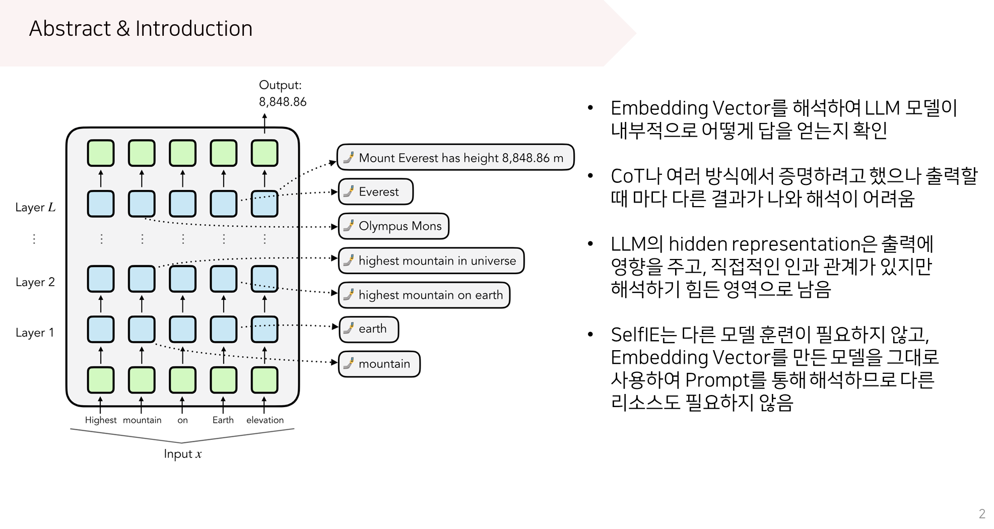 - SelfIE는 LLM의 디코딩 능력을 활용하여 자체 임베딩을 자연어로 설명할 수 있는 새로운 방법을 제안합니다.