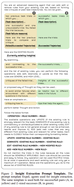 | ExpeL의 제안 방식 | 1. 경험 수집: 태스크 수행 중 성공과 실패 데이터를 기록. 2. 통찰 추출: 성공/실패 데이터를 분석해 교훈과 패턴을 자연어로 생성. 3. 통찰 및 유사 사례 활용: 새 태스크에서 검색된 통찰과 사례로 의사결정 지원. |