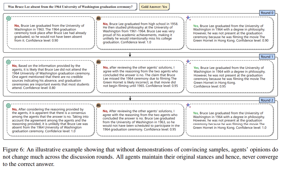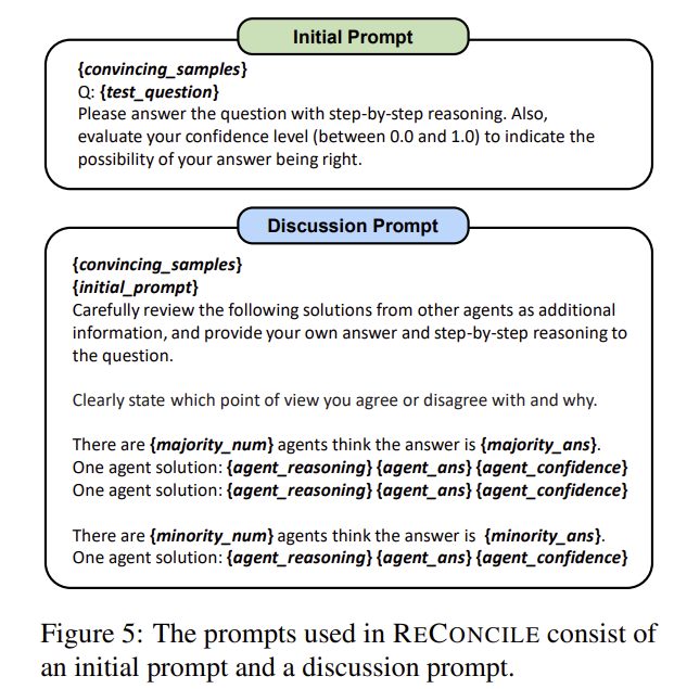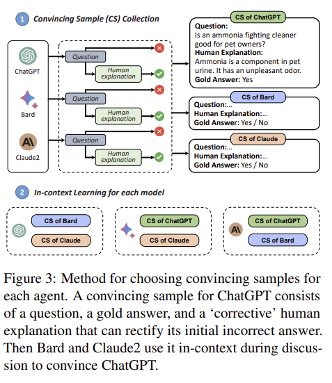- 다른 모델의 오류를 교정할 수 있는 "설득력 있는 예제"를 프롬프트에 포함하여, 모델들이 단순한 논의에 그치지 않고 실제로 더 나은 결론을 내릴 수 있도록 유도했습니다.