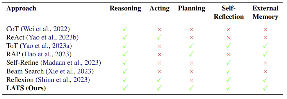 - LATS는 추론(Reasoning), 행동(Acting), 계획(Planning) 모두를 통합하는 유일한 프레임워크로, 다중 도메인에서 동작 가능.