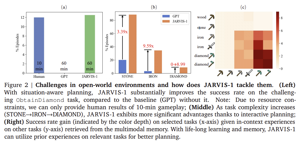 - 텍스트 기반 지식과 메모리: 외부 텍스트 지식(Minecraft Wiki 등)과 메모리를 활용하여 작업 성능 극대화.