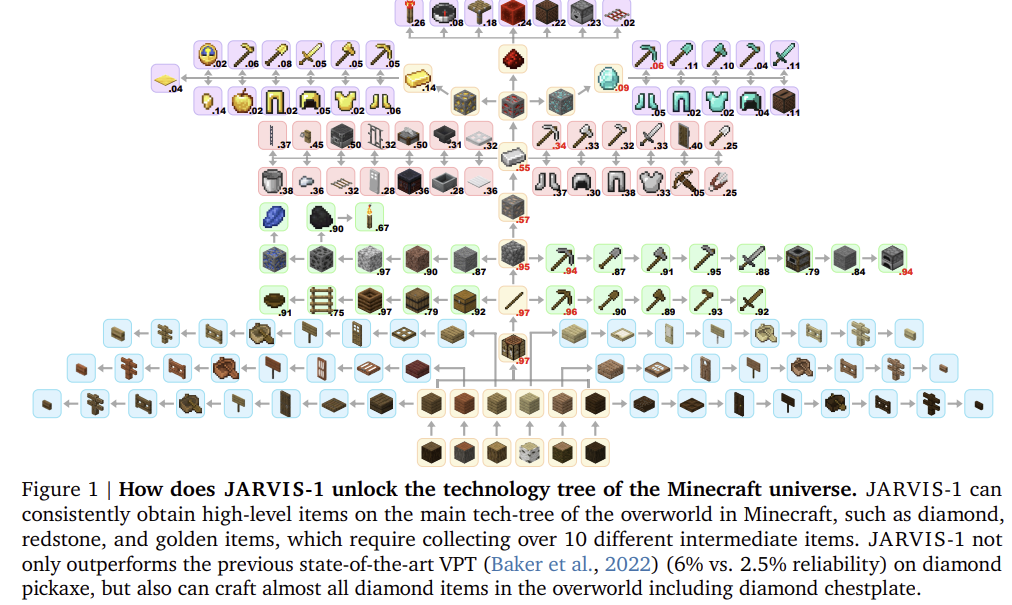 - 특정 작업의 높은 성공률(예: ObtainDiamond)로 Minecraft 연구에서 새로운 표준 제시.