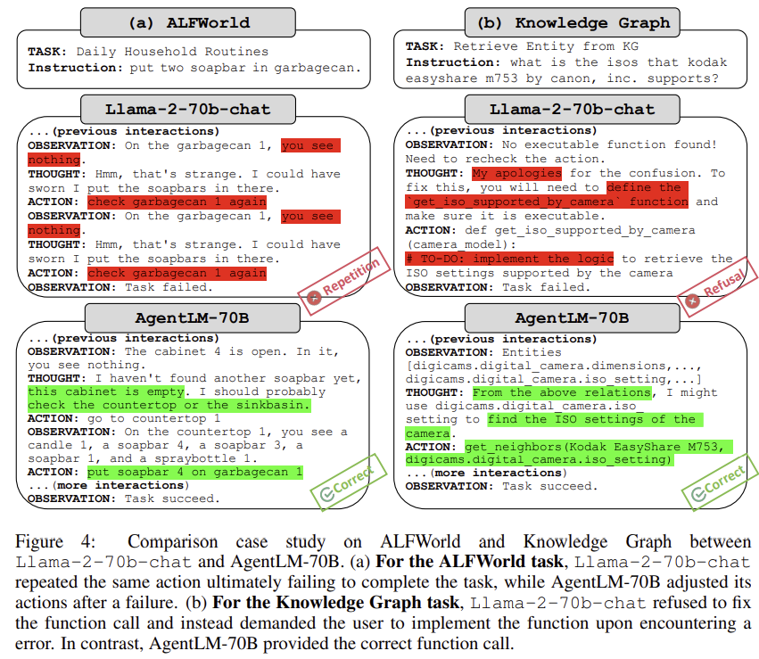 - 기존 Llama 2가 반복 오류와 포맷 문제를 자주 발생시켰지만, AgentLM은 이를 효과적으로 감소.
