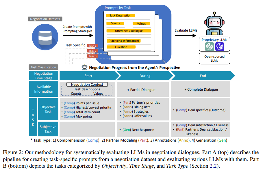 | 평가 방식 | - 태스크 설계: 35개 태스크로 세분화(이해, 주석, 파트너 모델링, 응답 생성). - 시간 단계: 협상 시작(Start), 진행(During), 종료(End)로 구분. - 객관적(정답 존재) 및 주관적(심리 상태 추론) 평가로 나눔. |
