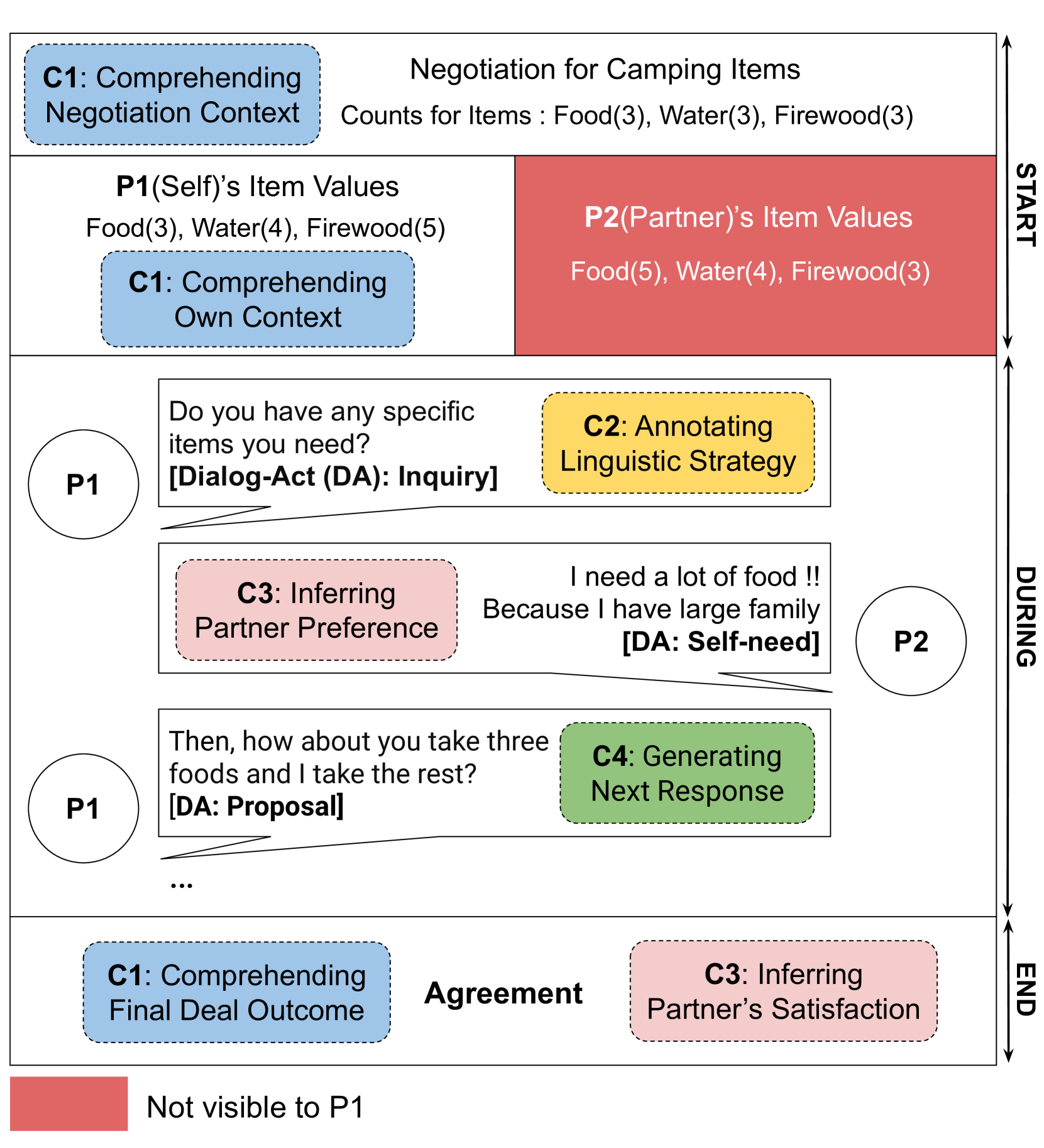 | End | 협상 대화 전체(Complete Dialogue) | 최종 결과(Outcome)와 만족도 평가 (Comp, Part). |