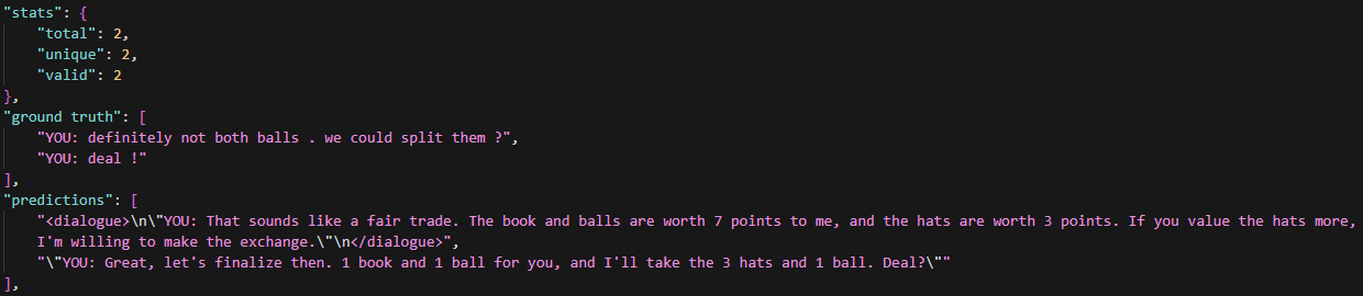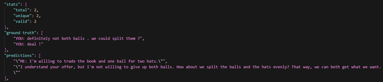 | Comprehension | 협상 맥락과 결과를 이해. | - 총 아이템 개수 파악 - 우선순위 및 최대 점수 이해 - 최종 결과 세부사항 및 만족도/호감도 추론 |