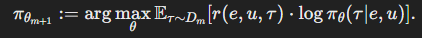 - 목적: 탐색 데이터를 활용해 보상이 높은 경로의 확률을 증가시키는 방향으로 학습.