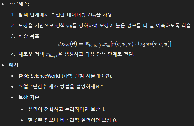 - 탐색 단계: 에이전트가 새로운 작업과 환경을 탐색하며 데이터를 생성.