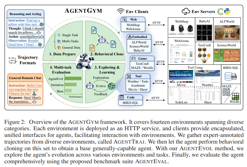 - AGENTGYM은 초기 행동 복제를 통해 작업 기본 능력을 학습하고, 탐색 및 학습 단계를 반복해 성능을 개선.