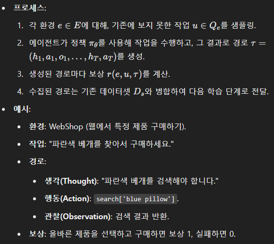 - 예를 들어, WebShop 환경에서 "검색" 및 "구매" 작업을 수행하는 기초적인 경로(trajectory)를 학습.