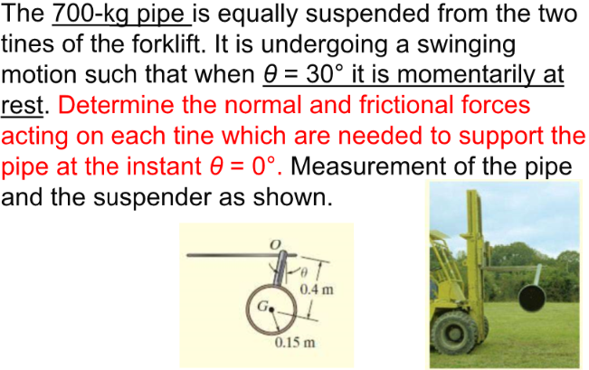 700kg의 파이프가 지게차(forklift)의 두 개의 포크(갈퀴) 위에 균등하게 올려져 있다고 생각해보세요. 이 파이프는 줄로 매달려 있는 상태라 약간 흔들리는 '진자'처럼 움직일 수 있습니다. 문제에서는 파이프가 어떤 특정 순간에 각도 θ=30∘ 에서 잠시 멈추었다가, 중력에 이끌려 다시 θ=0∘ 즉 가장 아래 위치로 내려오는 상황을 다룹니다. - 질문: