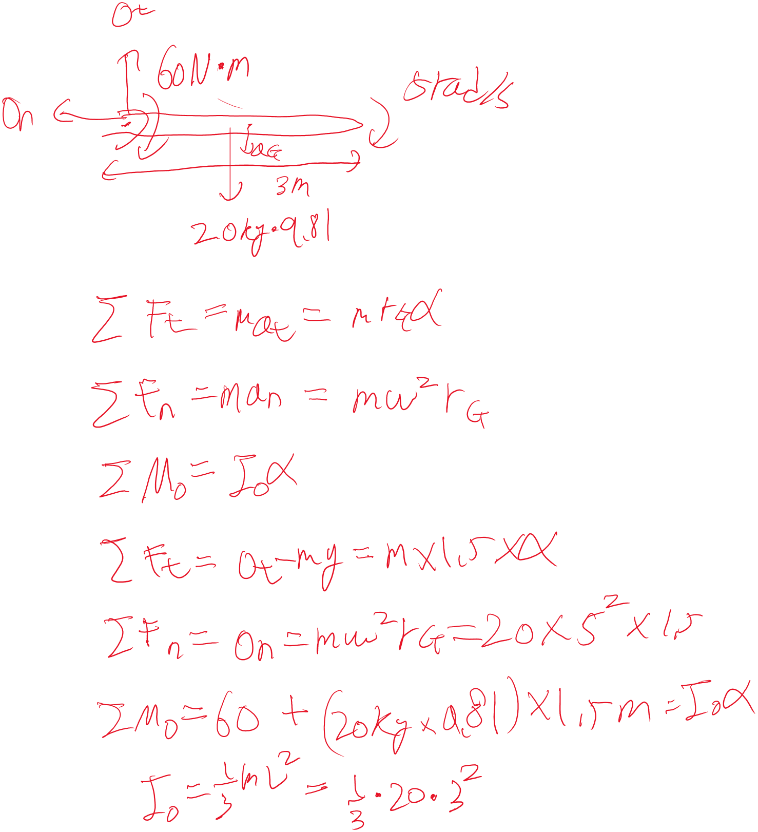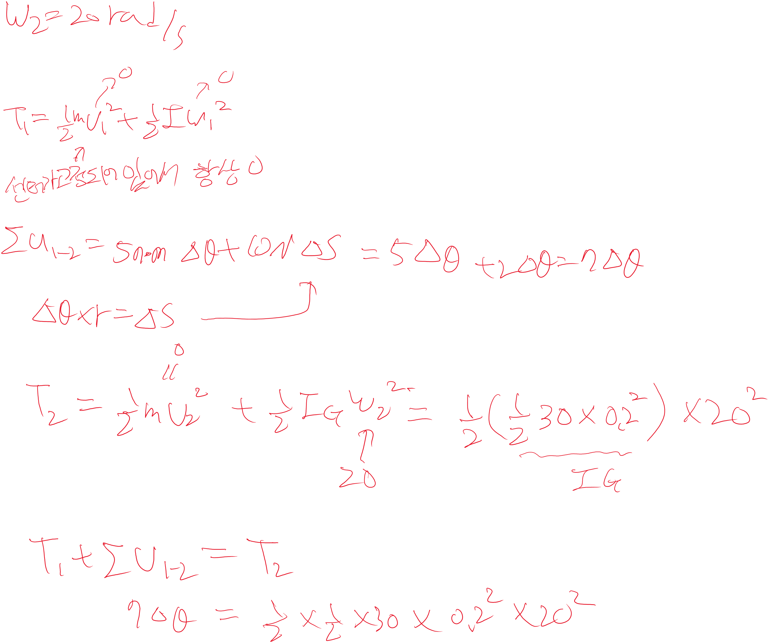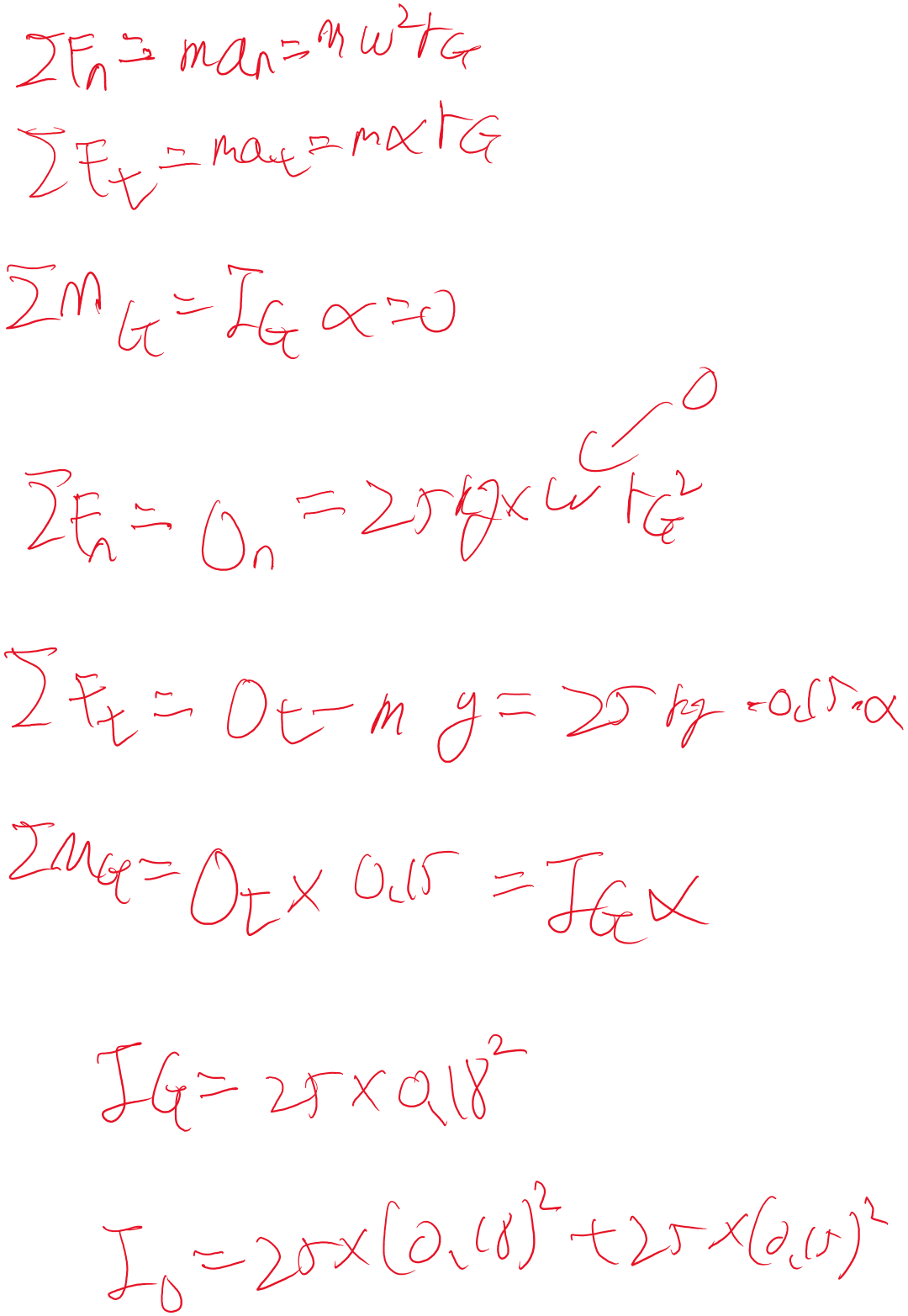 30° 위에 있을 때의 위치에너지 감소분이 0°에서의 운동에너지로 전환됩니다. 이 과정을 통해 0°에서 파이프의 질량중심 G의 속도를 구할 수 있습니다. (문제에서 자세한 수치가 주어지면, 그걸로 계산 가능합니다.) 대략적으로 계산해보면 0°에서 약 1m/s 정도의 속도를 가지게 될 수 있습니다. - 0° 지점에서의 중심가속도(원운동 가속도):