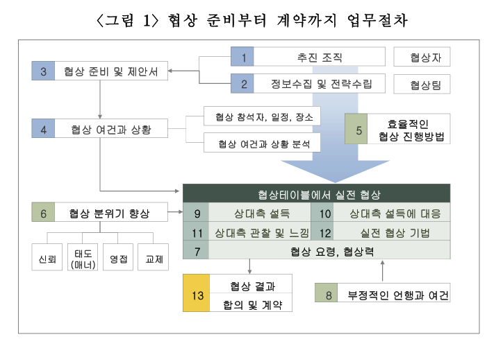 - 협상의 전체 과정을 세분화: 비즈니스 진행 과정을 도식화하고, 협상 시작부터 계약 체결까지의 단계를 상세히 분석.