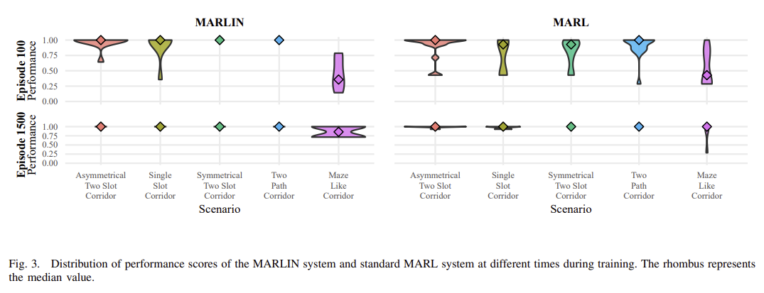 - 협소한 복도 환경에서 MARLIN이 기존 MAPPO 알고리즘 대비 빠르게 학습을 완료하며, 최종 성능도 우수한 것으로 나타남.