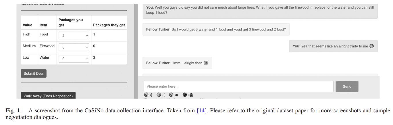 - CaSiNo Dataset: 캠핑 관련 협상 대화 데이터로, 다중 이슈 협상 환경에서 참여자들의 감정, 인구 통계 및 성격 특성을 포함.