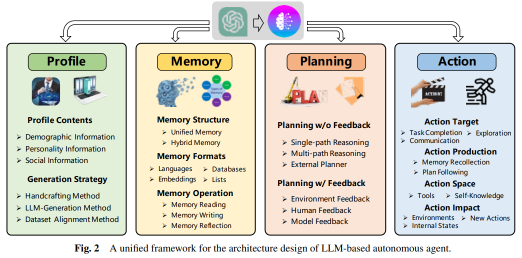 이 Figure 2는 LLM 기반 자율 에이전트(Large Language Model-based Autonomous Agents)의 아키텍처 설계를 위한 통합 프레임워크를 나타냅니다. 에이전트의 주요 구성 요소인 프로파일(Profile), 메모리(Memory), 계획(Planning), 행동(Action)의 상호작용을 체계적으로 설명합니다.