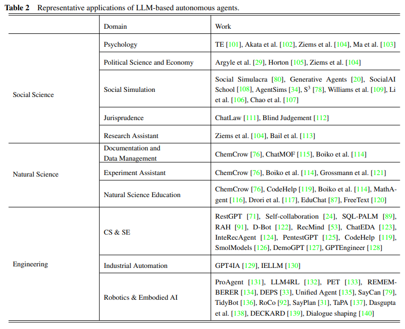 - LLM 기반 에이전트는 사회 과학, 자연 과학, 공학 등 다양한 분야에서 활용되고 있으며, 인간과의 협업 또는 대체가 가능하도록 발전하고 있습니다.