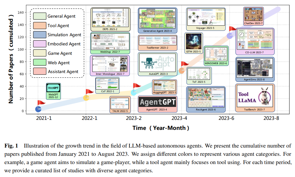 - 시간이 지남에 따라 LLM 기반 에이전트 연구가 급속도로 성장했음을 보여줍니다.