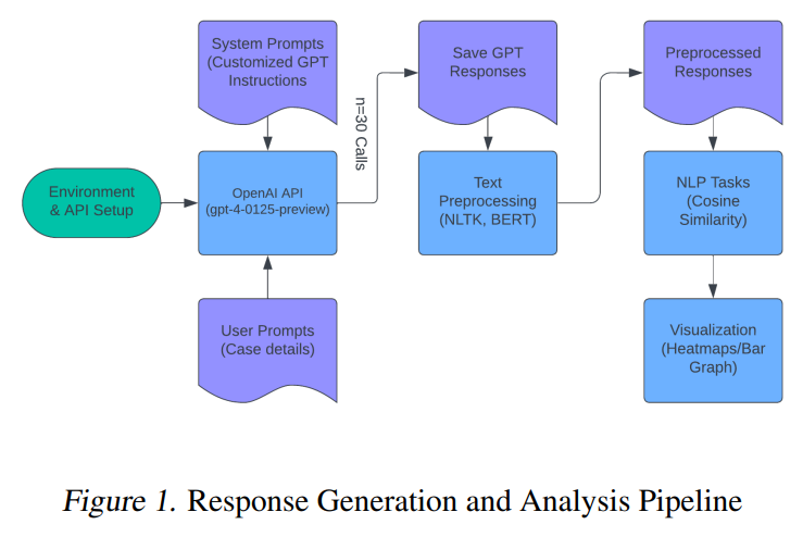 이 Figure는 "Response Generation and Analysis Pipeline"으로, 연구에서 OpenAI GPT-4를 활용하여 데이터를 처리하고 분석하는 전체적인 과정을 단계적으로 보여줍니다. 각각의 블록은 데이터 입력부터 결과 시각화까지의 주요 과정을 나타냅니다. 아래에서 각 단계를 상세히 설명하겠습니다.