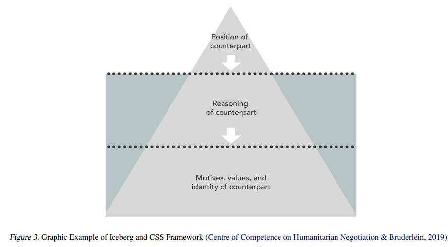 이 Figure는 Iceberg and CSS Framework의 그래픽적 표현으로, 협상 과정에서 상대방의 행동과 동기를 이해하기 위한 도구로 사용됩니다. Iceberg(빙산) 모델은 협상 상대방의 표면적 요구와 깊은 동기를 구조적으로 분석하는 데 도움을 줍니다. 아래에서 각 층위를 설명하겠습니다.