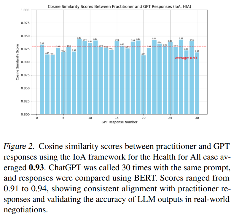 이 Figure는 IoA(Island of Agreement) 프레임워크를 활용한 협상 사례에서 LLM(ChatGPT) 출력과 인간 전문가 응답 간 코사인 유사도(Cosine Similarity) 점수를 보여줍니다. Figure를 분석하면 다음과 같은 핵심 내용과 결과를 확인할 수 있습니다.