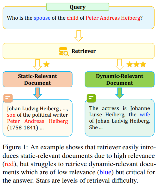 - 문제: 기존의 단순 리트리버는 정적 관련 문서를 쉽게 검색할 수 있지만, 동적 관련 문서는 질의와 유사도가 낮아 검색 과정에서 누락될 가능성이 높습니다.
