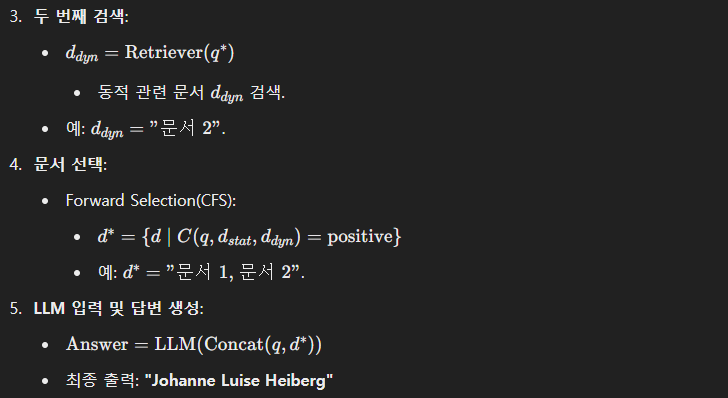 | 방법론 구성 | - 첫 번째 검색: 정적 관련 문서(d_stat) 검색. - 질의-문서 결합: 정적 문서와 질의를 결합해 확장 질의 생성. - 두 번째 검색: 동적 문서(d_dyn) 검색. - 문서 선택: Forward/Inverse Selection으로 중복 제거 및 품질 최적화. - LLM 호출: 정제된 문서를 사용해 최종 답변 생성. |