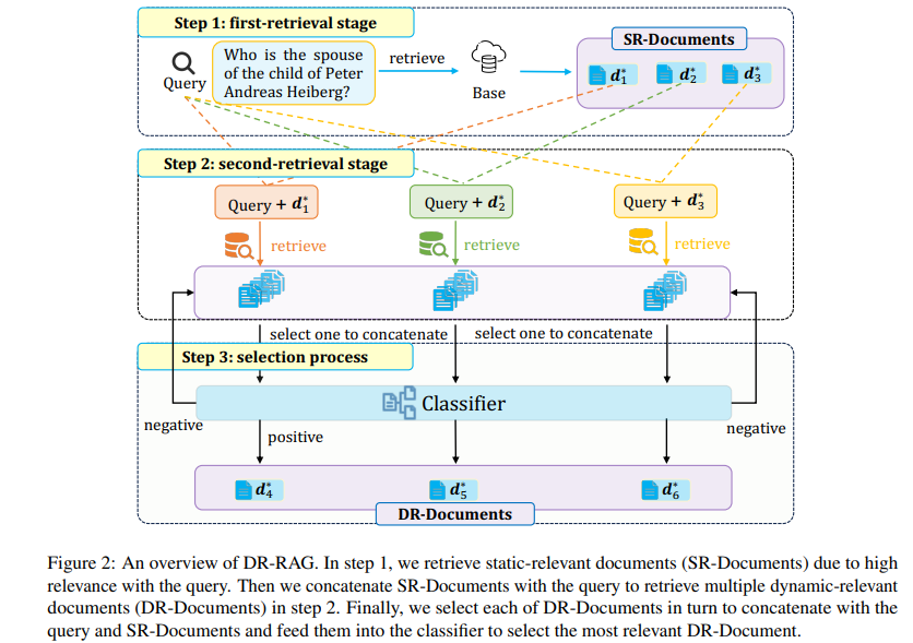 - 첫 번째 검색에서 얻은 SR 문서와 질의를 결합하여, 동적 관련 문서(DR-Documents)를 추가로 검색합니다.