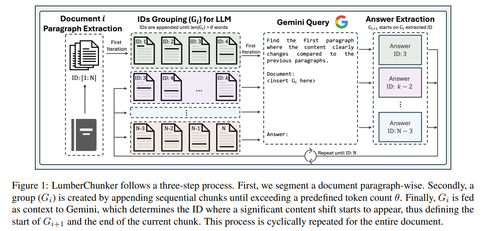 - 이 그림은 LumberChunker의 동적 세분화 프로세스를 간결하게 시각화하며, 각 단계를 명확히 구분하여 청크 생성 과정의 흐름을 보여줍니다.