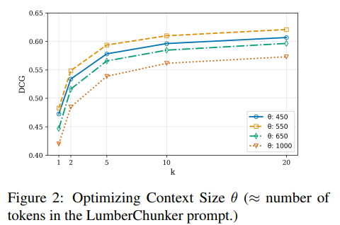 이 그래프(Figure 2)는 LumberChunker의 컨텍스트 크기(Context Size, θ) 최적화를 다룬 결과를 보여줍니다. 그래프는 DCG(Discounted Cumulative Gain)@k 점수를 기준으로, 토큰 임계값 θ의 변화가 검색 성능에 미치는 영향을 나타냅니다.