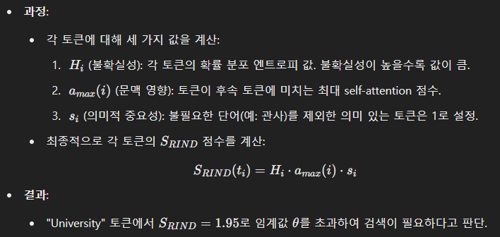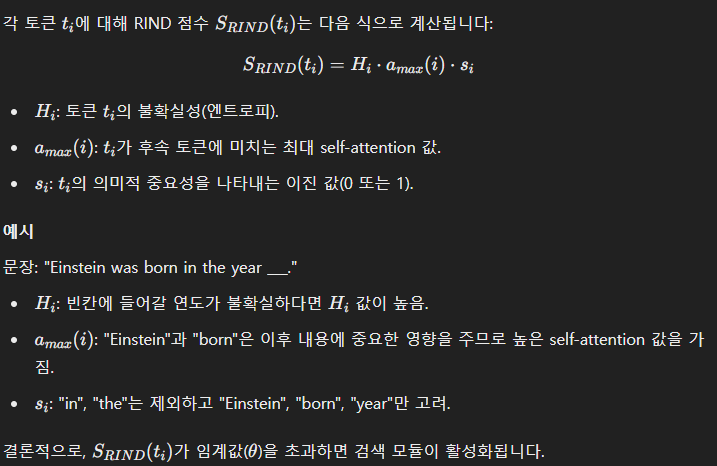 | RIND | - 불확실성(Entropy): 생성된 토큰의 확률 분포가 균일한 경우 검색 활성화. - 문맥 영향(Self-attention): 후속 토큰에 중요한 영향을 미치는 토큰 식별. - 의미적 중요성: 의미 없는 단어 제거 후 중요한 단어만 고려. |