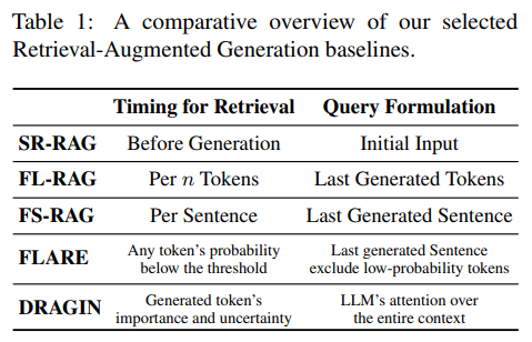 이 표는 다양한 Retrieval-Augmented Generation (RAG) 기법들의 검색 타이밍(Timing for Retrieval)과 검색 쿼리 작성(Query Formulation) 방식을 비교한 내용입니다. DRAGIN이 기존 방법론과 어떻게 차별화되는지 보여줍니다.