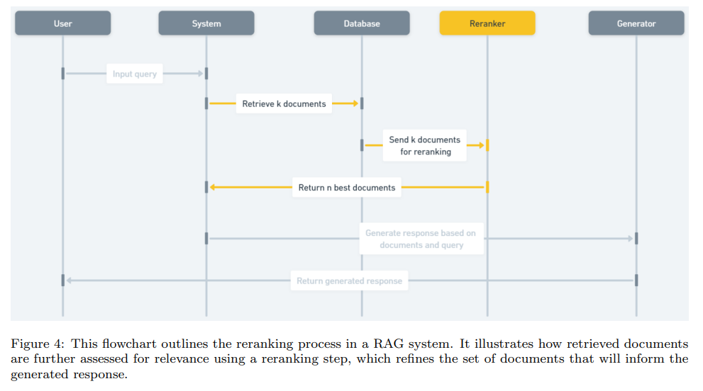 이 Figure는 Retrieval-Augmented Generation (RAG) 시스템에서 재정렬(reranking) 프로세스를 시각적으로 보여줍니다. 재정렬 단계는 검색된 문서들 중 가장 관련성이 높은 문서를 선별하여 응답 생성의 품질을 향상시키는 데 중점을 둡니다. 아래는 각 단계에 대한 설명입니다.