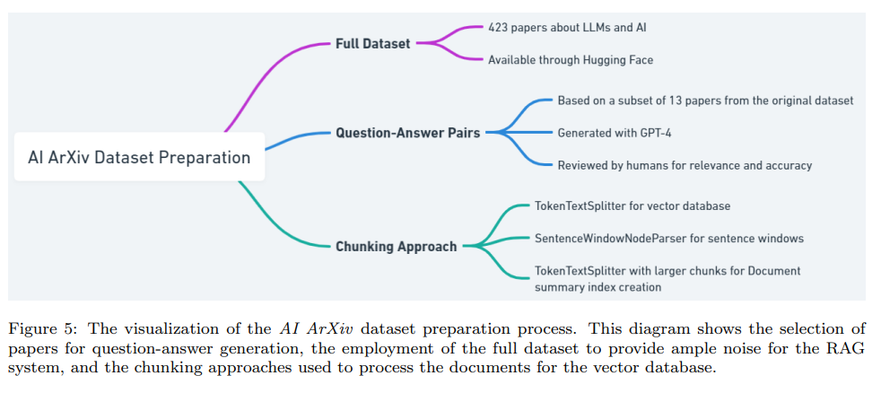 | 데이터 | - 423개 논문(AI ArXiv 데이터셋) 사용. - 13개 핵심 논문과 410개 노이즈 데이터로 구성. - 질문-답변(QA) 데이터: 107개 쌍 (GPT-4 생성 후 검토). |