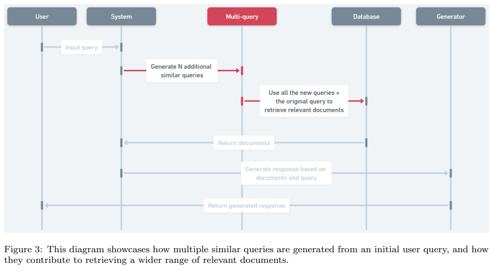 이 Figure는 Multi-query Retrieval 기법의 전체적인 과정을 시각적으로 보여줍니다. Multi-query Retrieval은 사용자의 단일 입력 질문(query)을 여러 유사한 질문들로 확장하여 더 넓고 포괄적인 검색을 가능하게 하는 RAG 기술 중 하나입니다. 아래는 각 단계에 대한 설명입니다.
