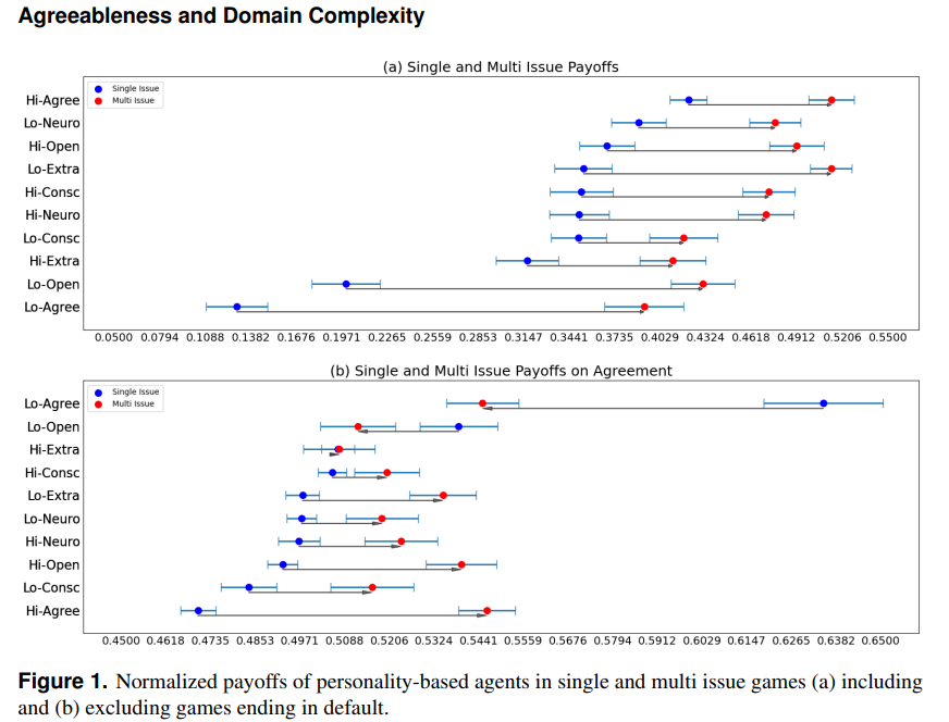 | 결과 | - 낮은 우호성(Low Agreeableness): 단일 이슈에서 상대를 착취하며 높은 수익 기록. - 높은 우호성(High Agreeableness): 다중 이슈에서 효율적 합의. |