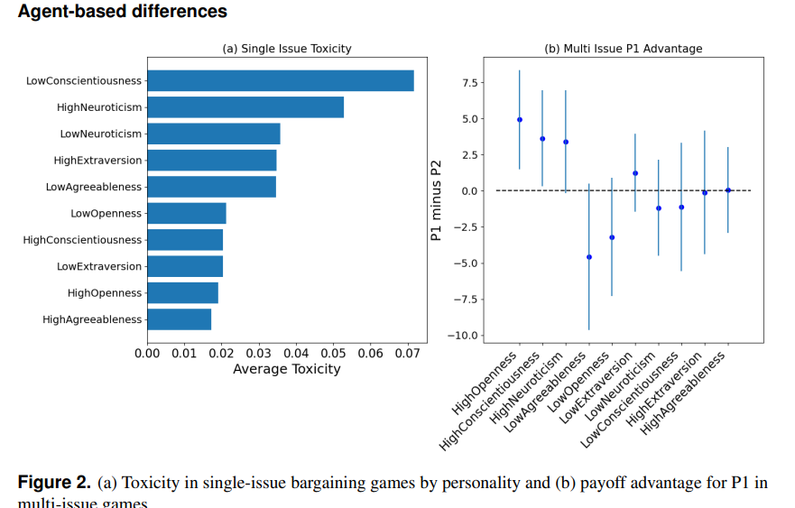 Figure 2는 성격 특성이 협상 게임에서 독성 언어 사용 및 P1(첫 제안자)의 수익 우위에 어떻게 영향을 미치는지를 보여줍니다. 두 그래프는 각각 독성 점수와 P1의 수익 차이를 나타냅니다.