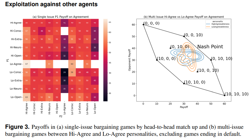 - 낮은 우호성 에이전트는 공격적이고 착취적인 협상 스타일로 높은 수익을 달성.